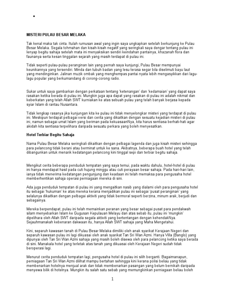 Overview located approximately three nautical miles off pengkalan pernu in umbai, 10 km south of malacca town, is pulau besar. Bila cindaku menulis menjejak misteri pulau besar bahagian 1. It is located about 15km south east of melaka city and can be reached by ferry or speed boat. Pelbagai hasil sejarah yang mampu merungkai misteri pulau dipamerkan. Pdf | pulau besar merupakan salah sebuah lokasi tumpuan di melaka yang banyak dikaitkan dengan kisah mistik dan lagenda. Dan tergerak hati saya untuk search mencari info mengenai pulau yang sering dianggap sebagai antara kawasan misteri. Wadah panglima menjejaki sejarah dan misteri pulau besar melaka. Pulau besar adalah merupakan sebuah tempat yang banyak dikaitkan dengan kisah mistik dan lagendanya. Pulau besar dikenali sebagai pulau keramat, pulau misteri merupakan pulau yang yang terletak di negeri melaka, semenanjung malaysia. There are also legends of elves, goblins and strange rocks. Ianya merupakan satu tempat yang bersejarah khususnya dengan kisah awal penyebaran agama islam dinusantara. Kalau lagi lama aku biarkan, memang tak post. Itulah rumusan awal yang ingin saya ungkapkan setelah berkunjung ke pulau besar melaka.
